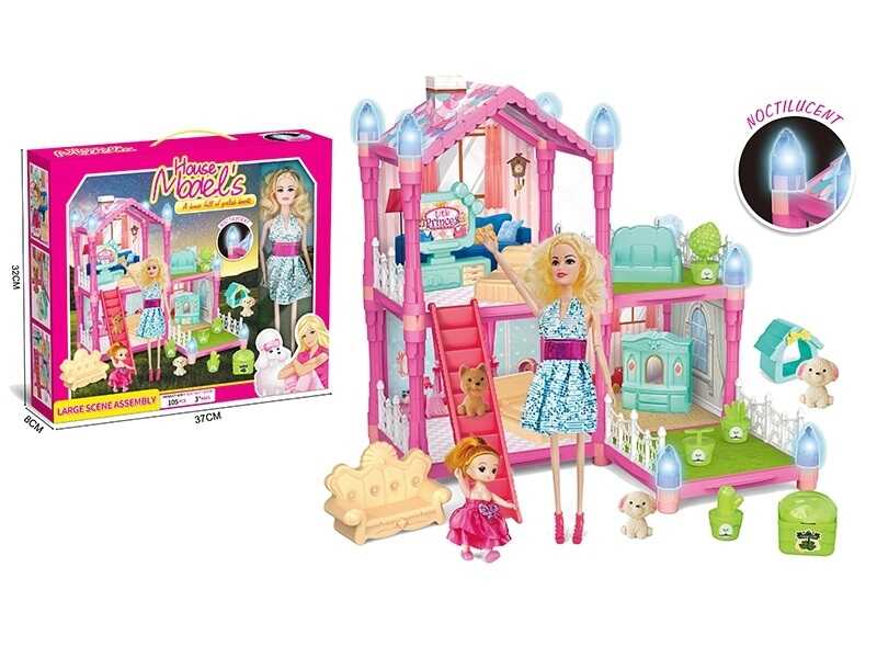 Будиночок-конструктор 179 деталей, 2 ляльки, флюоресцентні деталі, наліпки, меблі, 2 фігурки собак, в кор. 47*32*-8см