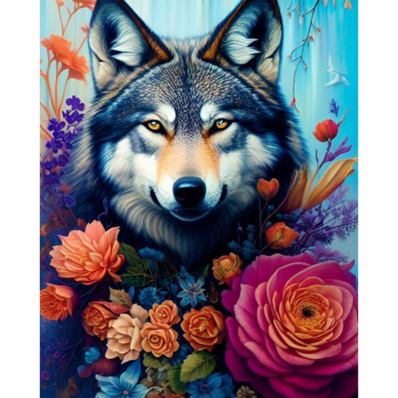 Алмазна мозаїка картина Вовк серед квітів на рамці розміром 40х50см, ТМ Strateg, Україна