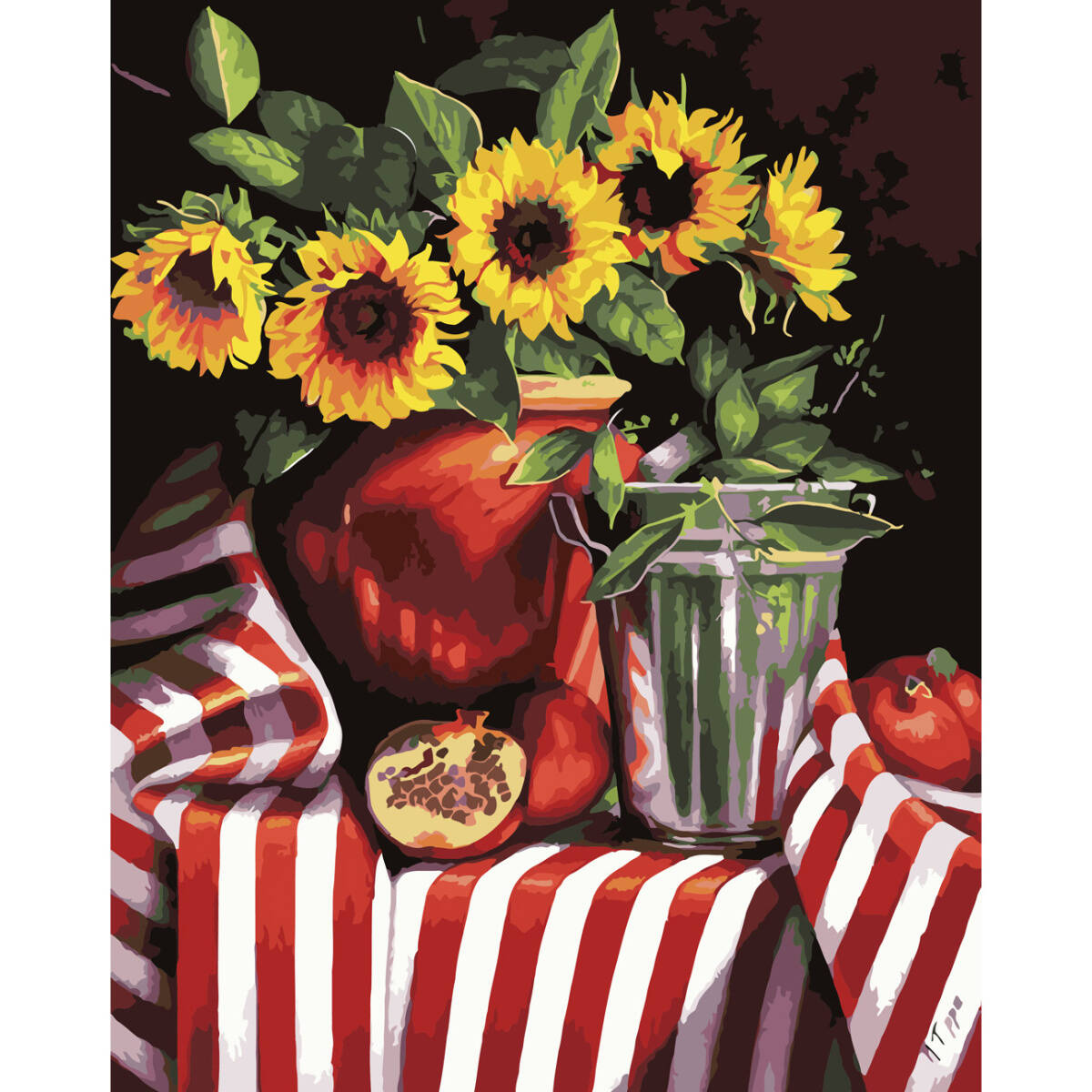 Картина за номерами "Гранат та соняшники" з лаком та рівнем, в термопакеті 40х50см, ТМ Стратег, Україна