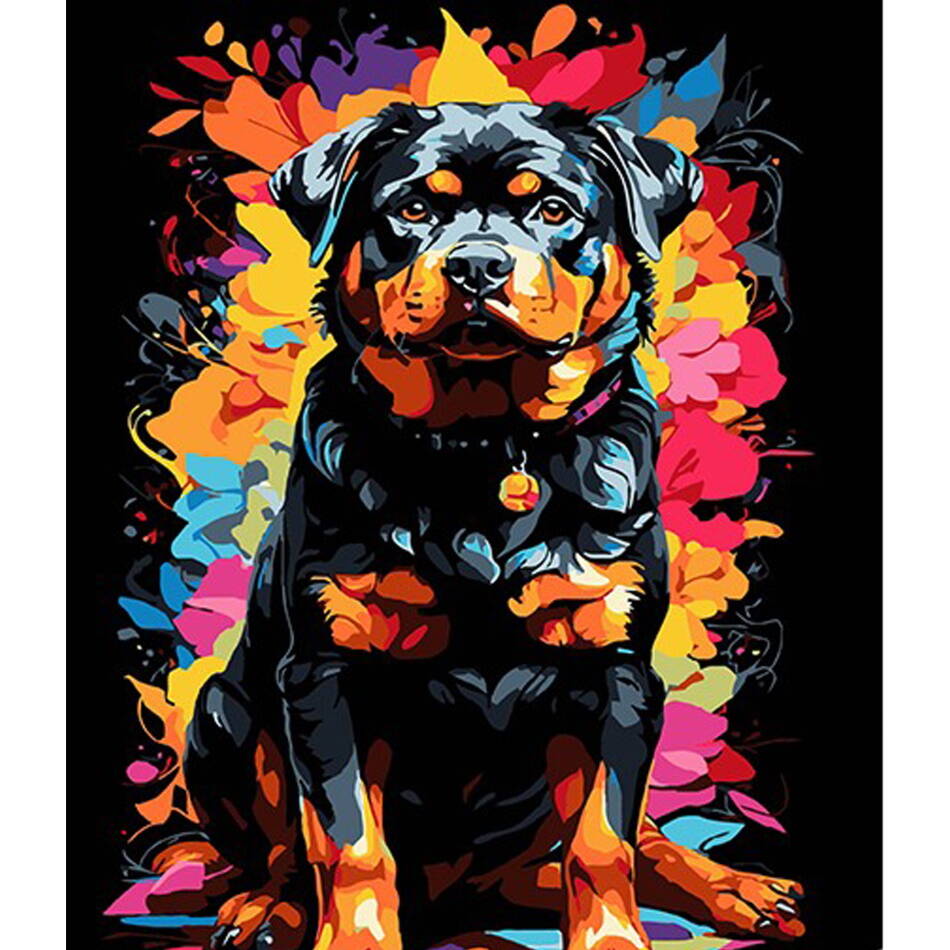 Картина за номерами Ротвейлер на фоні кольорових квітів на чорному фоні 30х40см, термопакет, ТМ Стратег, Україна