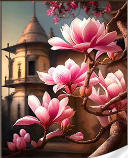 Алмазна мозаїка Сакура на фоні китайської пагоди 30х40см квадратні каміння стрази, термопакет, ТМ Стратег, Україна