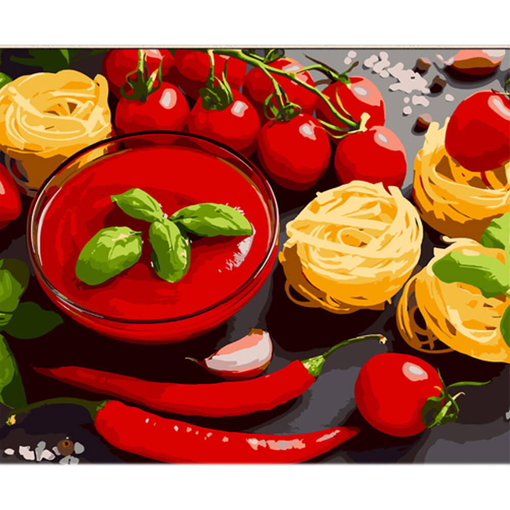 Картина за номерами Паста з чилі та томатами на кольоровому фоні 40х50см, термопакет, ТМ Стратег, Україна