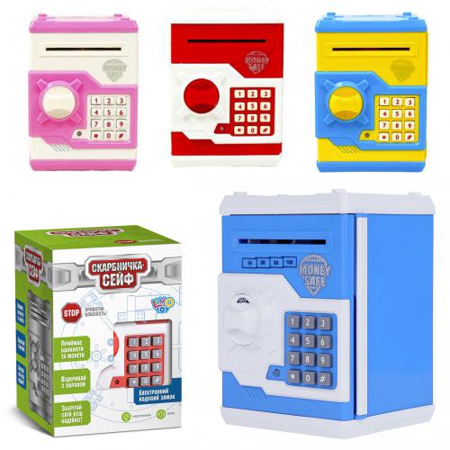 Скарбничка сейф із кодом, затяг.купюри, звук, світло, мікс кольорів, бат., в кор. 15*21*15см (24шт)