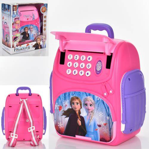 Скарбничка рюкзак, 19см, сейф з кодом, муз. звук(англ.), звуки тварин, затягує купюри, відбиток, 3 кольори, в кор. 16*26*8,5см (24шт)